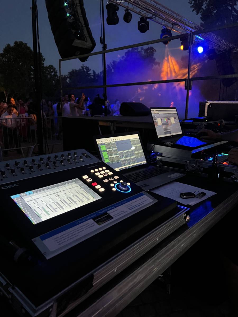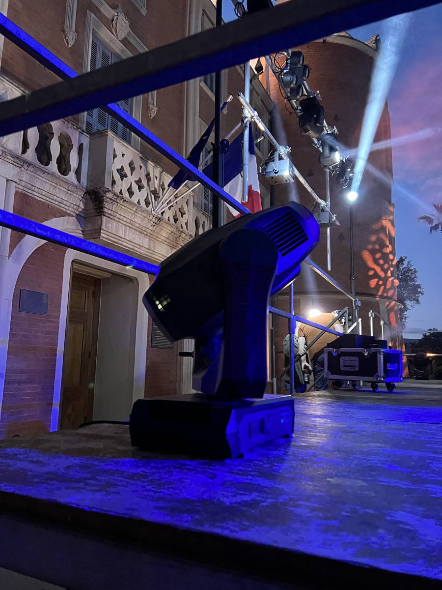 - Des Beam, des Wash, des strikers et des Par sur batterie Samba audio Pro, installées sur des structures